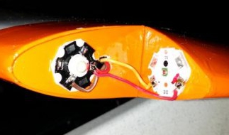 An den Tragflächenspitzen habe ich 2 LED´s mit je 1Watt für das Positionslicht und die Blitzer installiert.