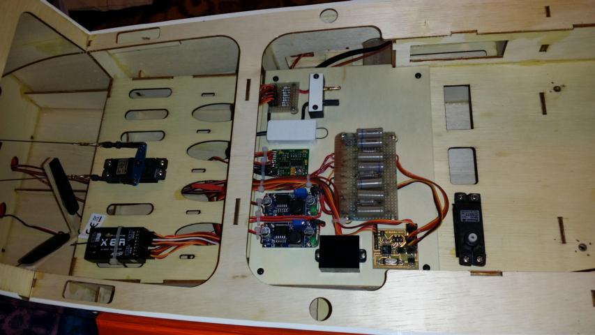 Das Modell wurde ordentlich verpackt und unbeschädigt geliefert. Zu meiner Überraschung waren sogar Taschen für Tragflächen, Seiten und Höhenruder dabei. Ich bestaunte gleich den riesigen Rumpf. Da ist reichlich Platz für Einbauten vorhanden. Als erstes klebte ich die Scharniere der Ruder ein montierte das Fahrwerk und begann mit dem Servoeinbau und den Anlenkungen. Dann bekam der Empfänger sein Plätzchen.
